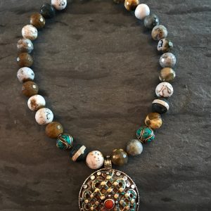 Earth Tone Agate Necklace with Large Tibetan Pendant