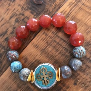 Crazy Lace Agate Beaded Gemstone Bracelet with Faceted Carnelian and a Turquoise Tibetan Disc
