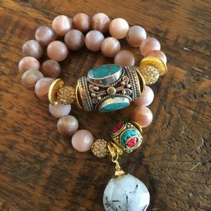 Matte Pink Moonstone and Tibetan Beaded Bracelets