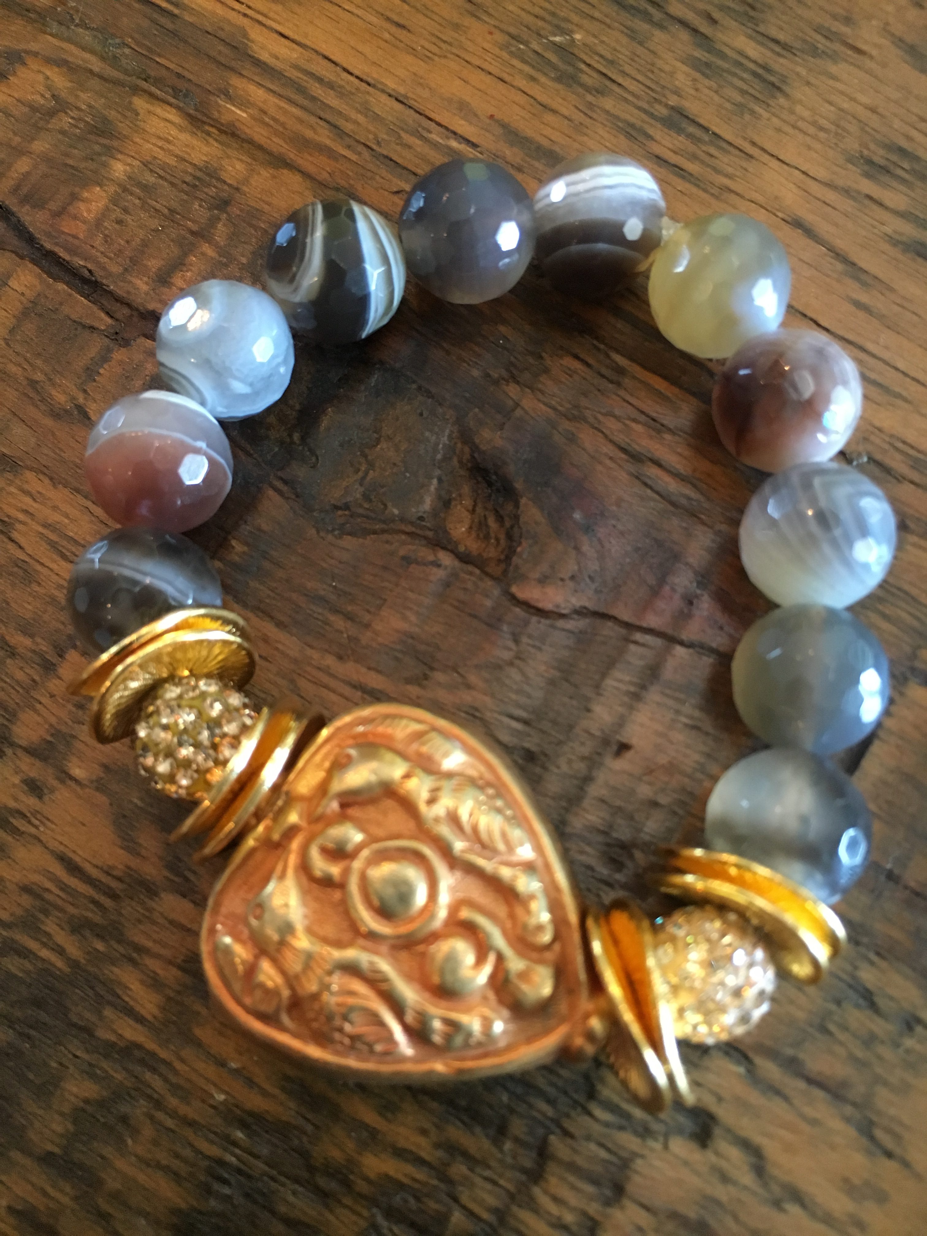 Beautiful 12mm Botswana agate is combined with an even more beautiful brass carved Tibetan Heart.  It is accented by pave beads and gold plated discs. Made with stretch elastic for an easy fit. Designed and handmade by Amy Gordon for the Styled By Amy Jewelry Collection.
