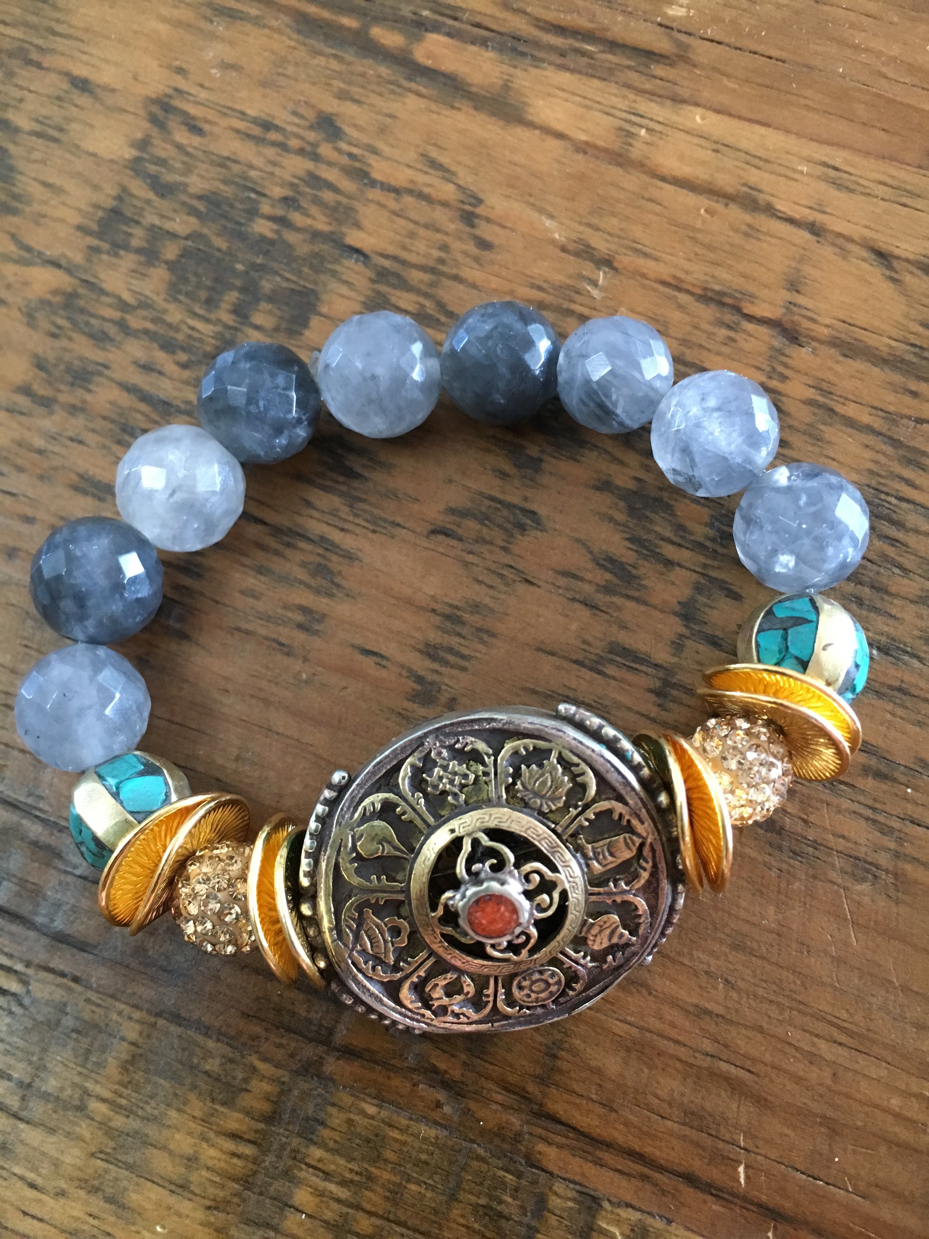 Simple yet elegant beaded bracelet made with cloudy crystal Quartz and Turquoise beads. This piece has a large Tibetan Brass disc and gold pave accents. Made on stretch elastic for an easy fit