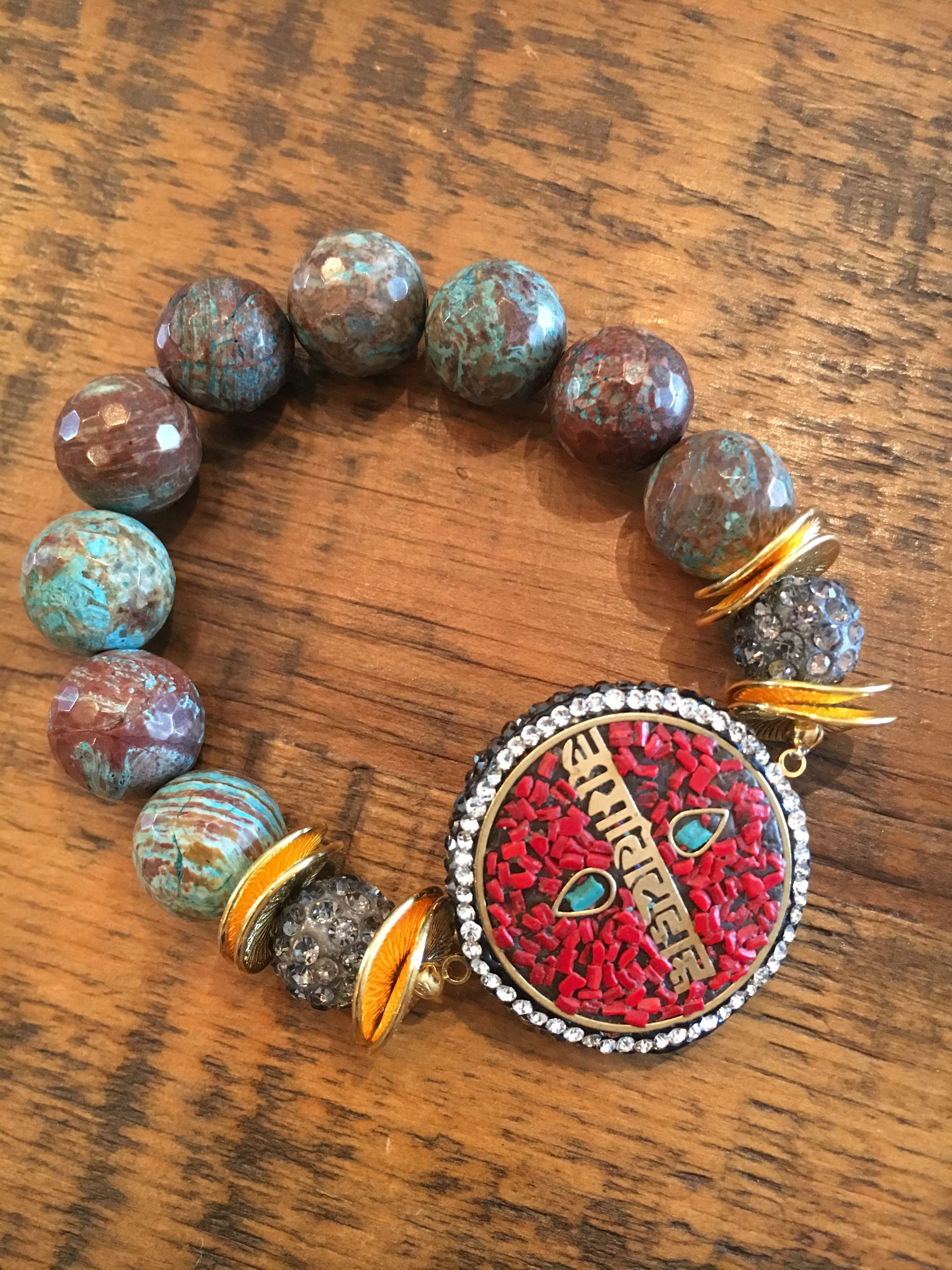 This beautiful, fun, and colorful bracelet combines 14 mm crazy agate beads with a gorgeous pave Tibetan disc.  The disc has inlaid Carnelian and turquoise. It is surrounded by pave and gold-plated accent beads. Made with stretch elastic for an easy fit. Designed and handmade by Amy Gordon for the Styled By Amy Jewelry Collection