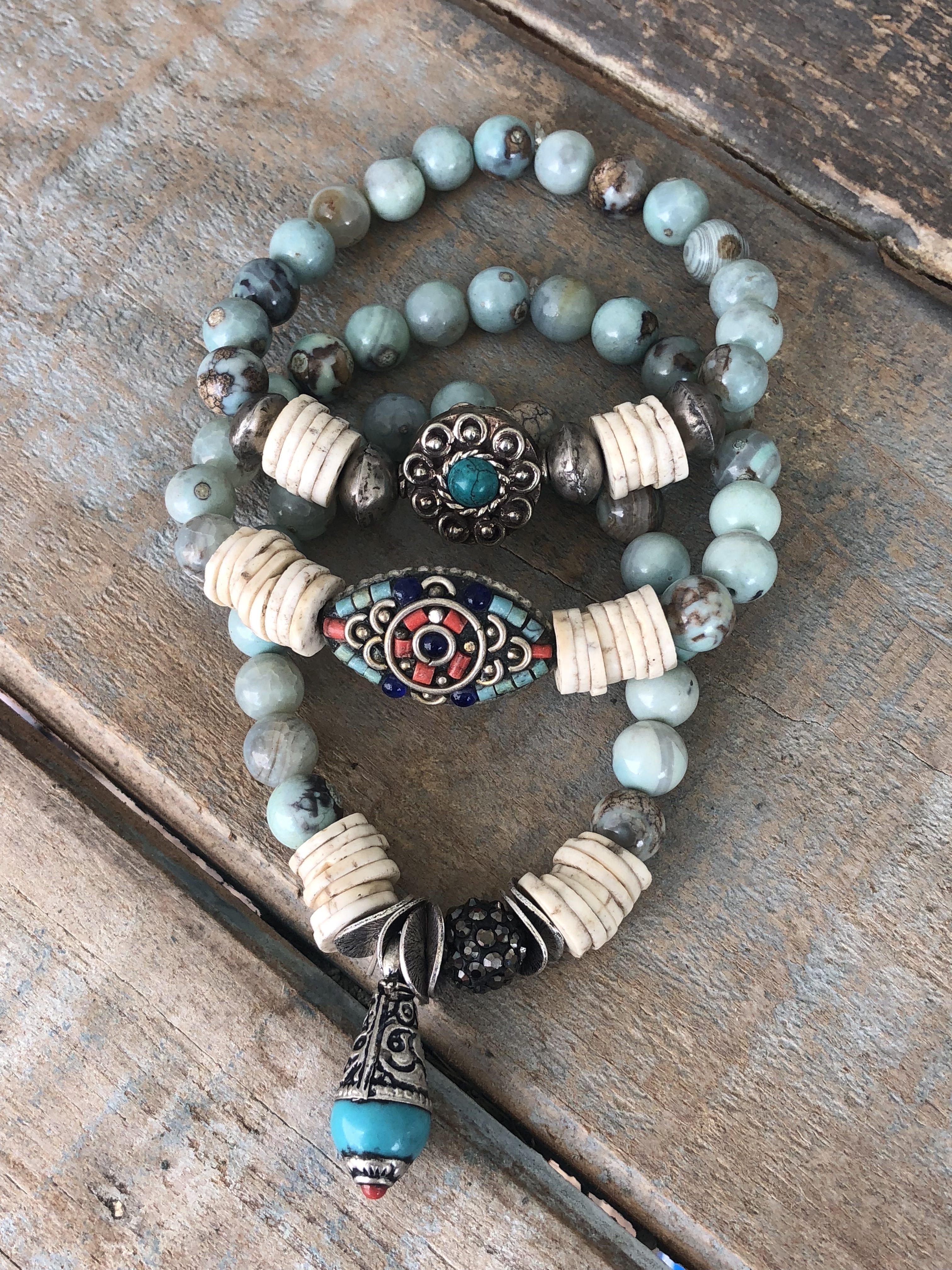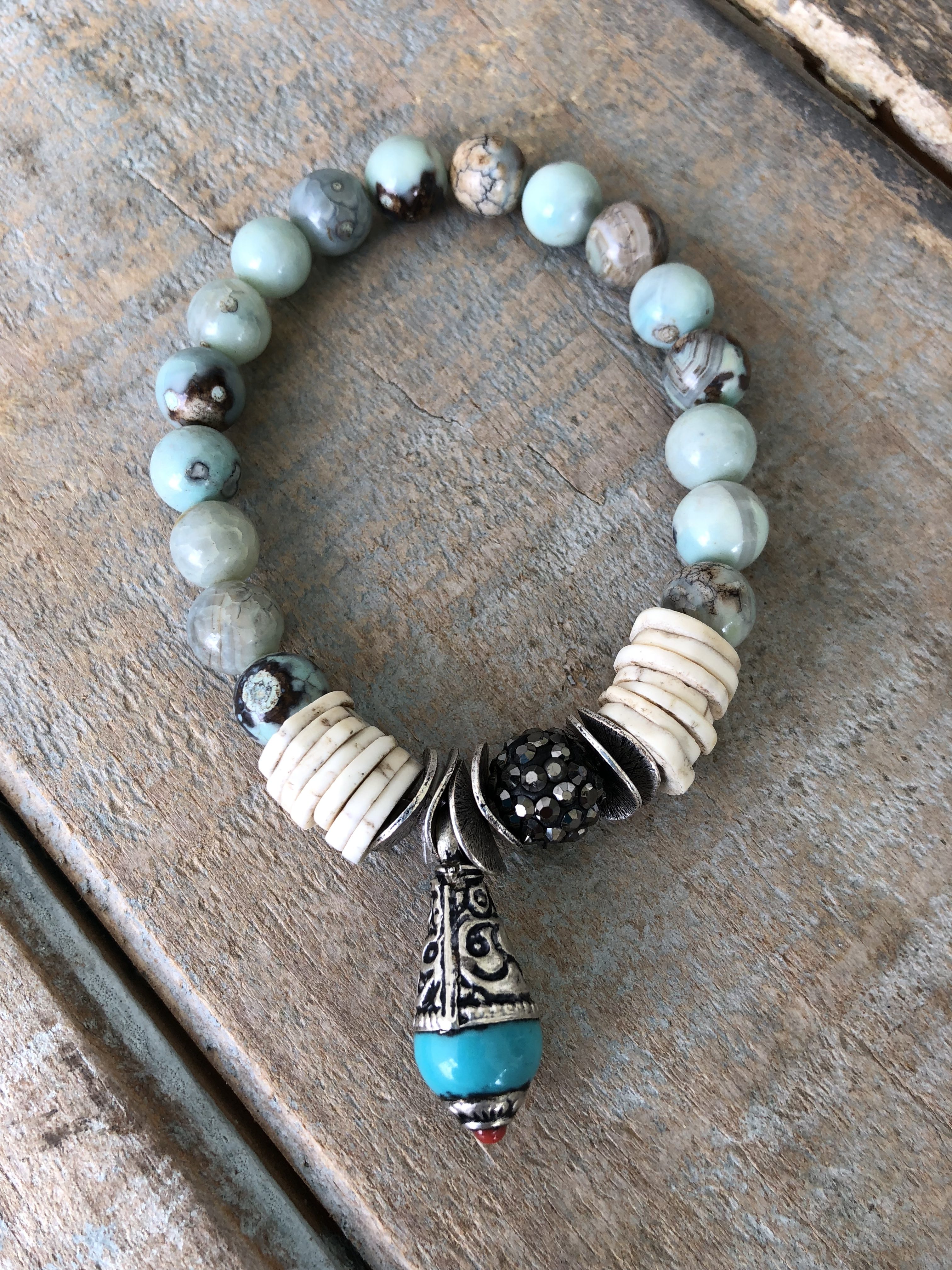 This delicate bracelet is made with 8mm fire Agate beads, African wood beads, and has a silver and turquoise drop and a pave accent bead.  Looks great in the middle of the stack it was designed with.  Constructed on stretch elastic for an easy fit.
