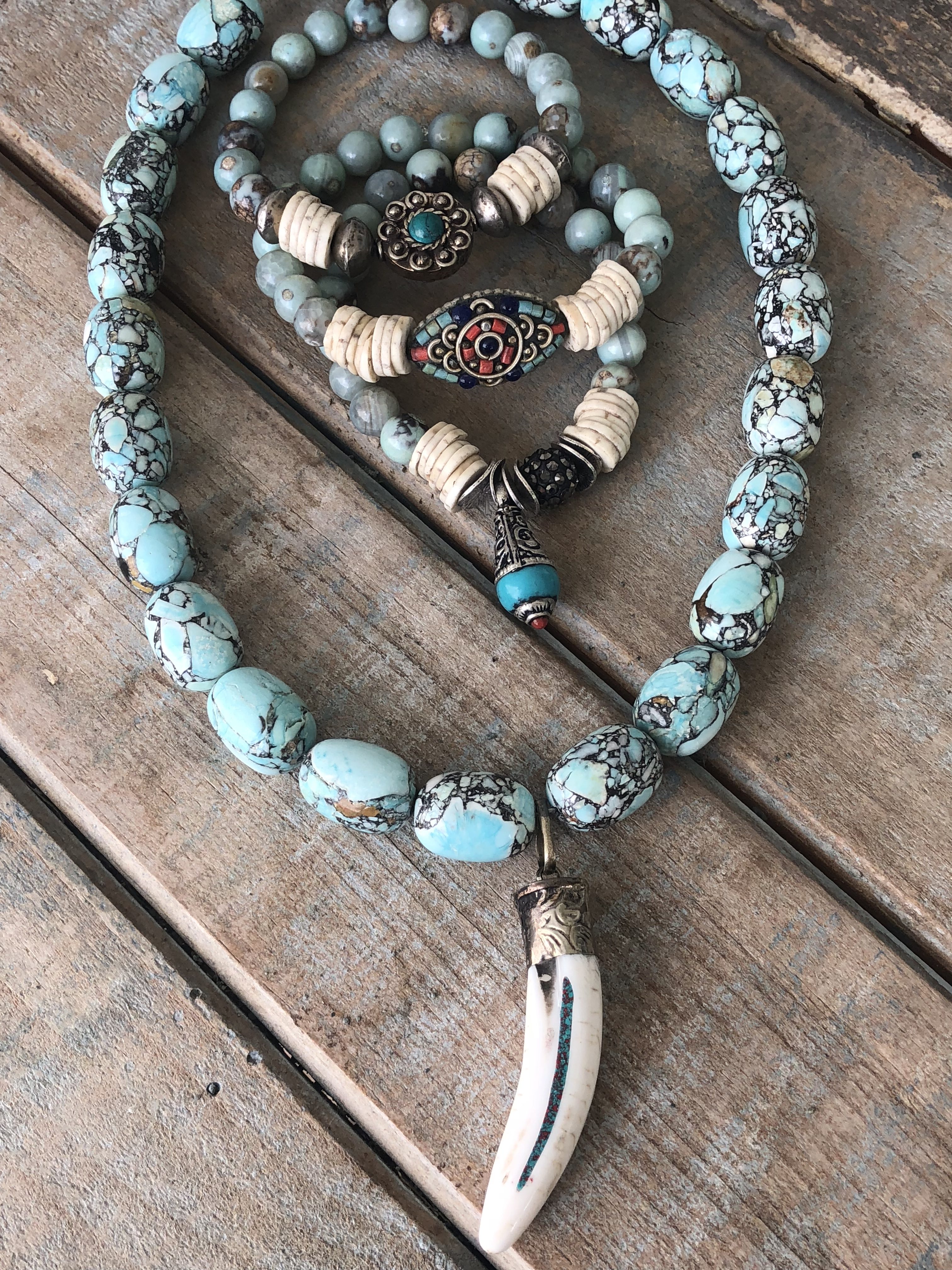 Be the first to review “Fire Agate Beaded Bracelet with Silver & Turquoise Tibetan Drop”
