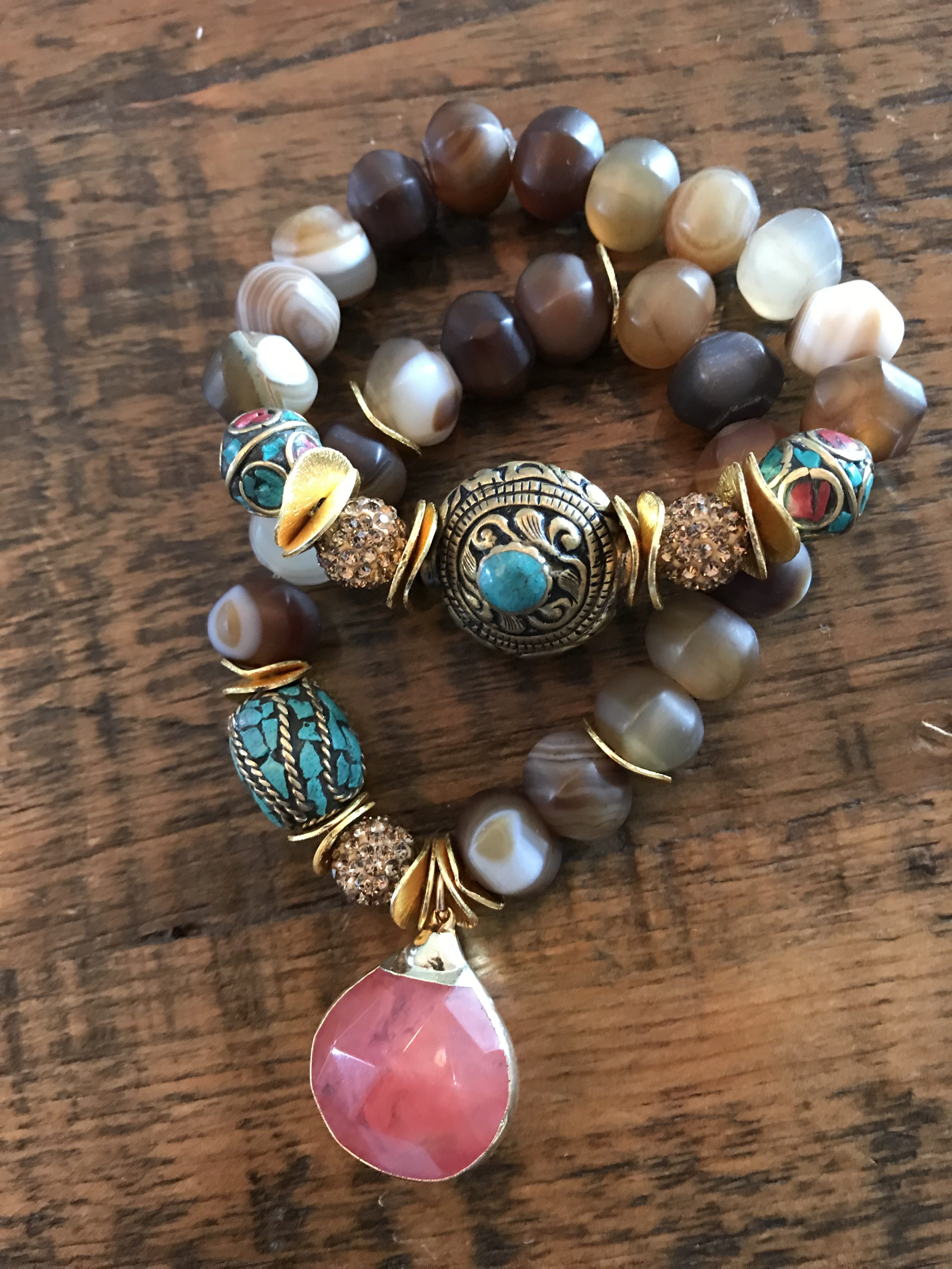 This pair of bracelets is made with beautiful large (~12mm) faceted frosted brown Agate rondelle beads and Tibetan accents with gold pave accent beads and a faceted Carnelian drop pendant. These are truly spectacular.
