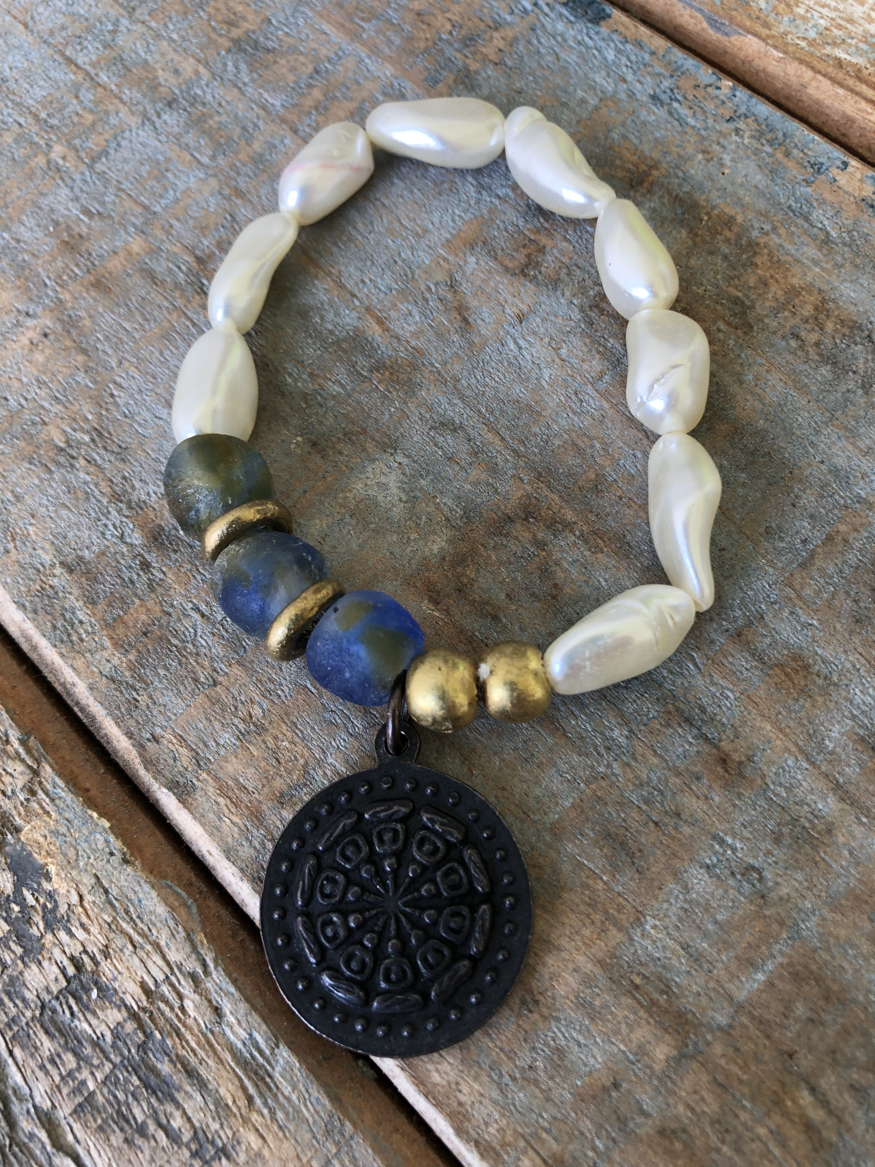 White Mother of Pearl beaded bracelet with contrasting blue African Glass and African Mali Beads completed with a Hill Tribe Pendant as the focal point. Stack this bracelet with the other beautiful bracelets and a necklace or two from our Sevai’i Collection to complete the look.