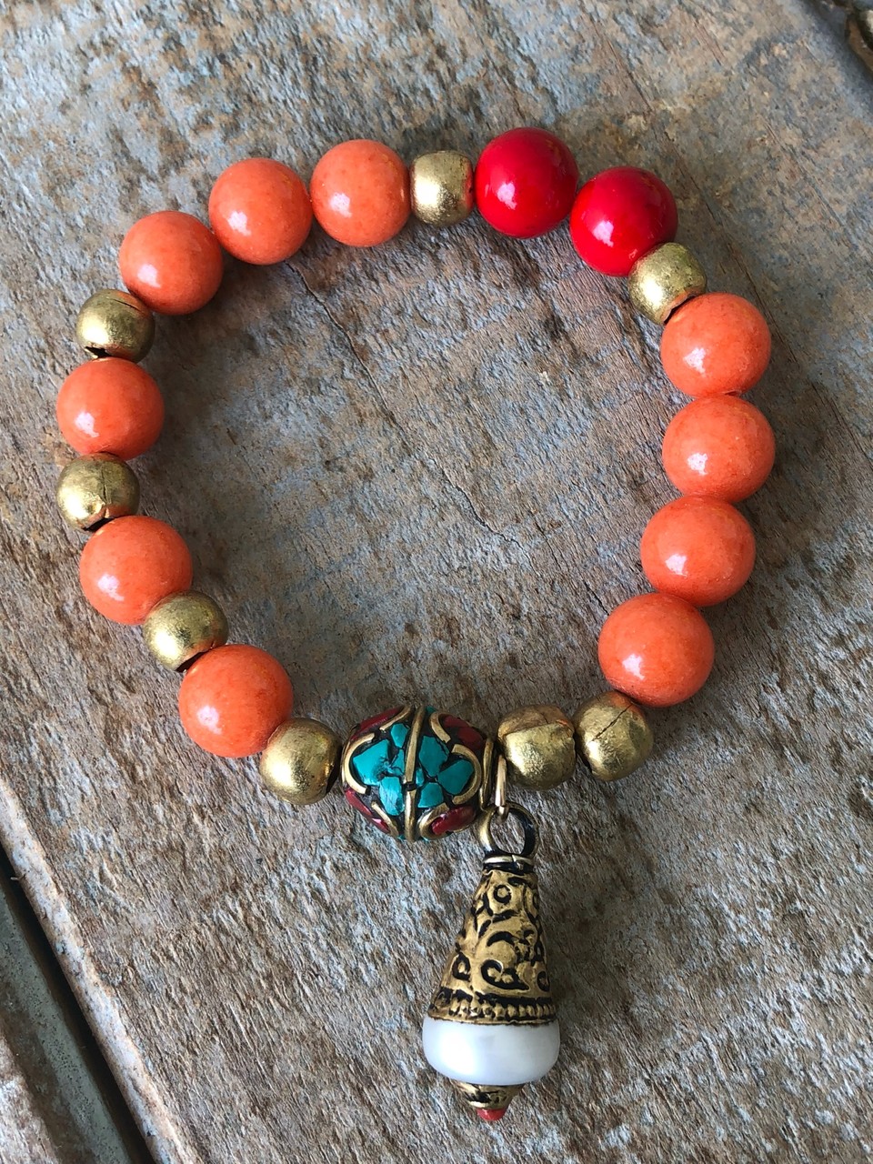 Composed of 10mm Polished Red and Orange Jade, gold African Mali Beads, a beautiful Tibetan Pearl Drop, and Small turquoise Tibetan Bead. Stack this bracelet with the other bracelets and a necklace or two from our Mabul Collection to complete the look. It would especially looks good paired with the Mabul Long Necklace.