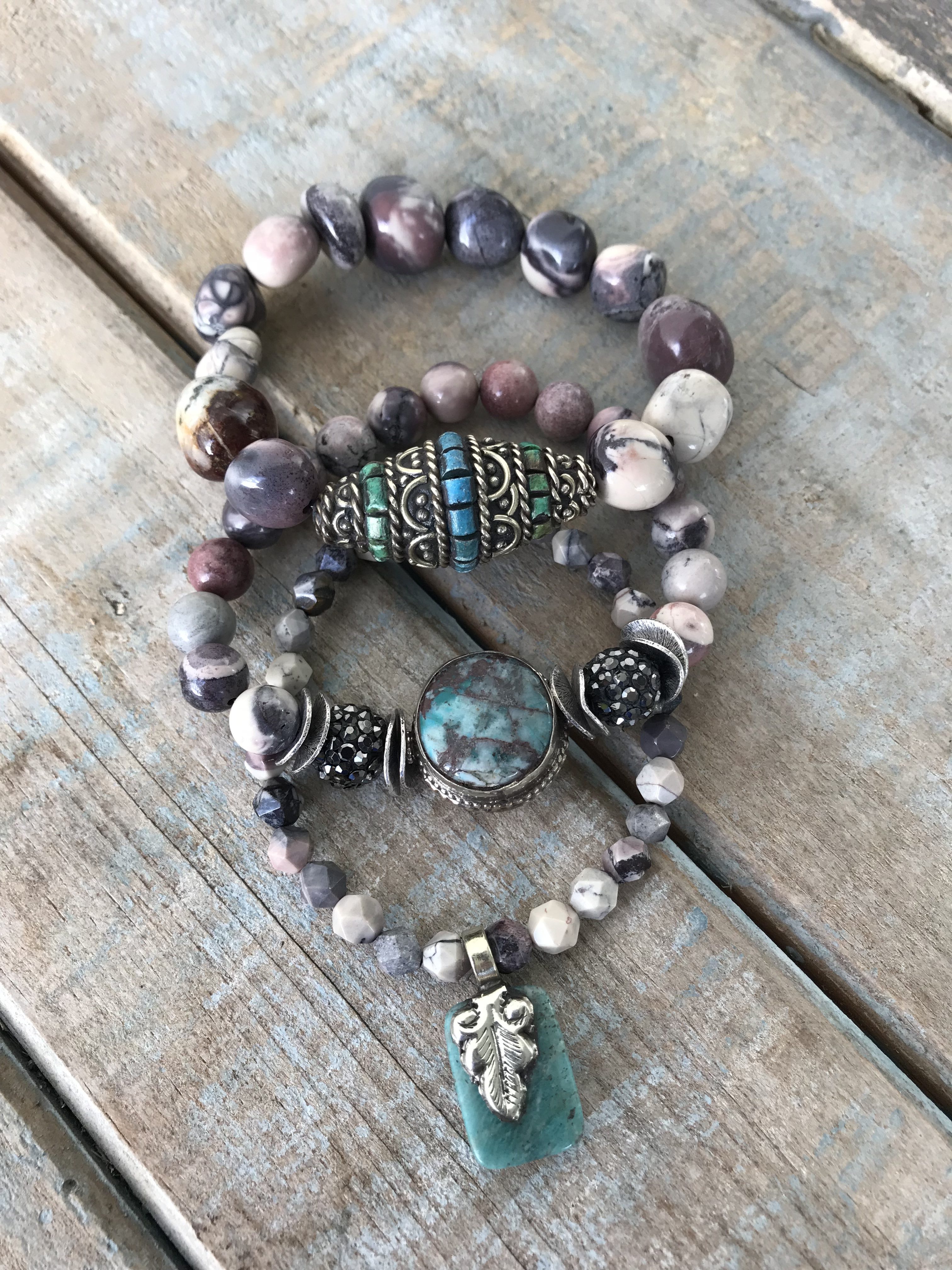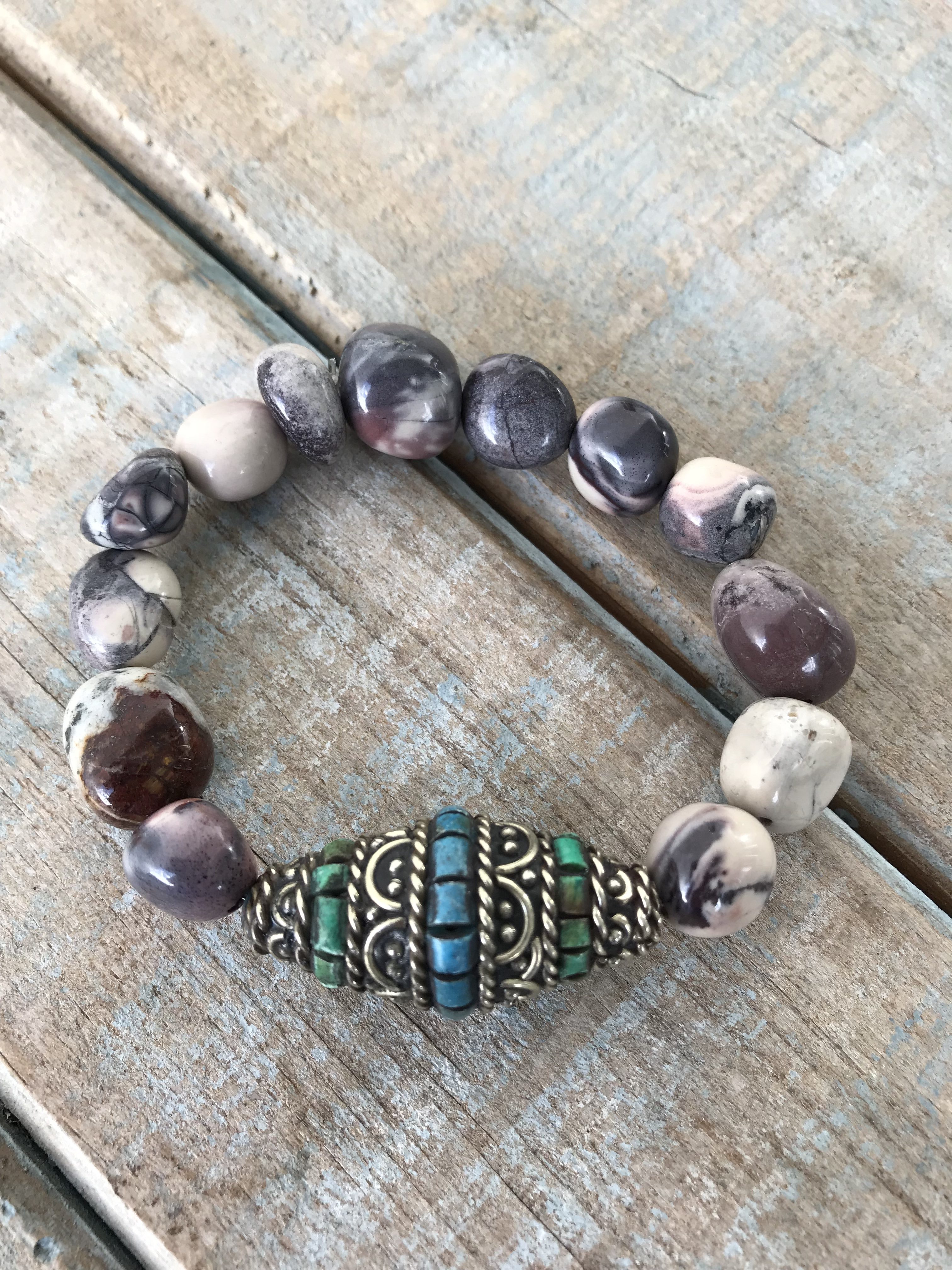 This beautiful purple and gray-toned bracelet is made with smooth Porcelain Jasper pebble-style beads and has a large silver and turquoise handmade Tibetan accent bead.