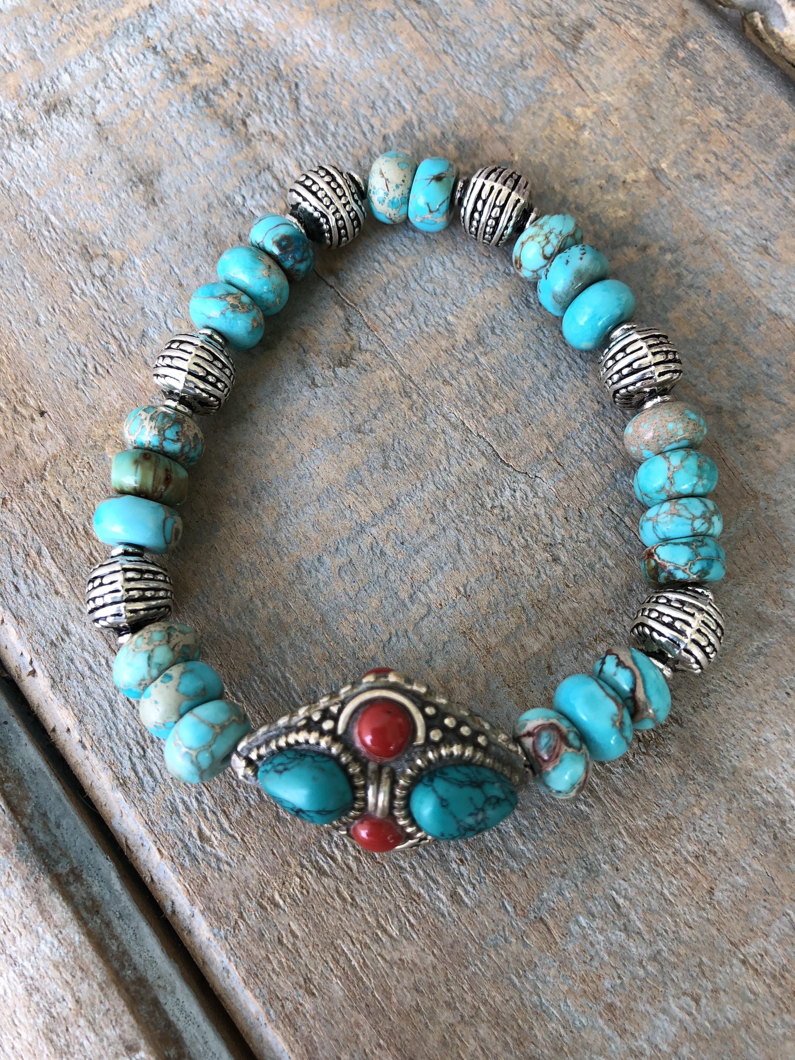 10x7mm Reconstituted turquoise beads and medium-sized Carnelian and Turquoise Tibetan silver bead and small silver accents create this small yet funky bracelet. Looks great in the coordinating stack. Constructed on stretch elastic for an easy fit.