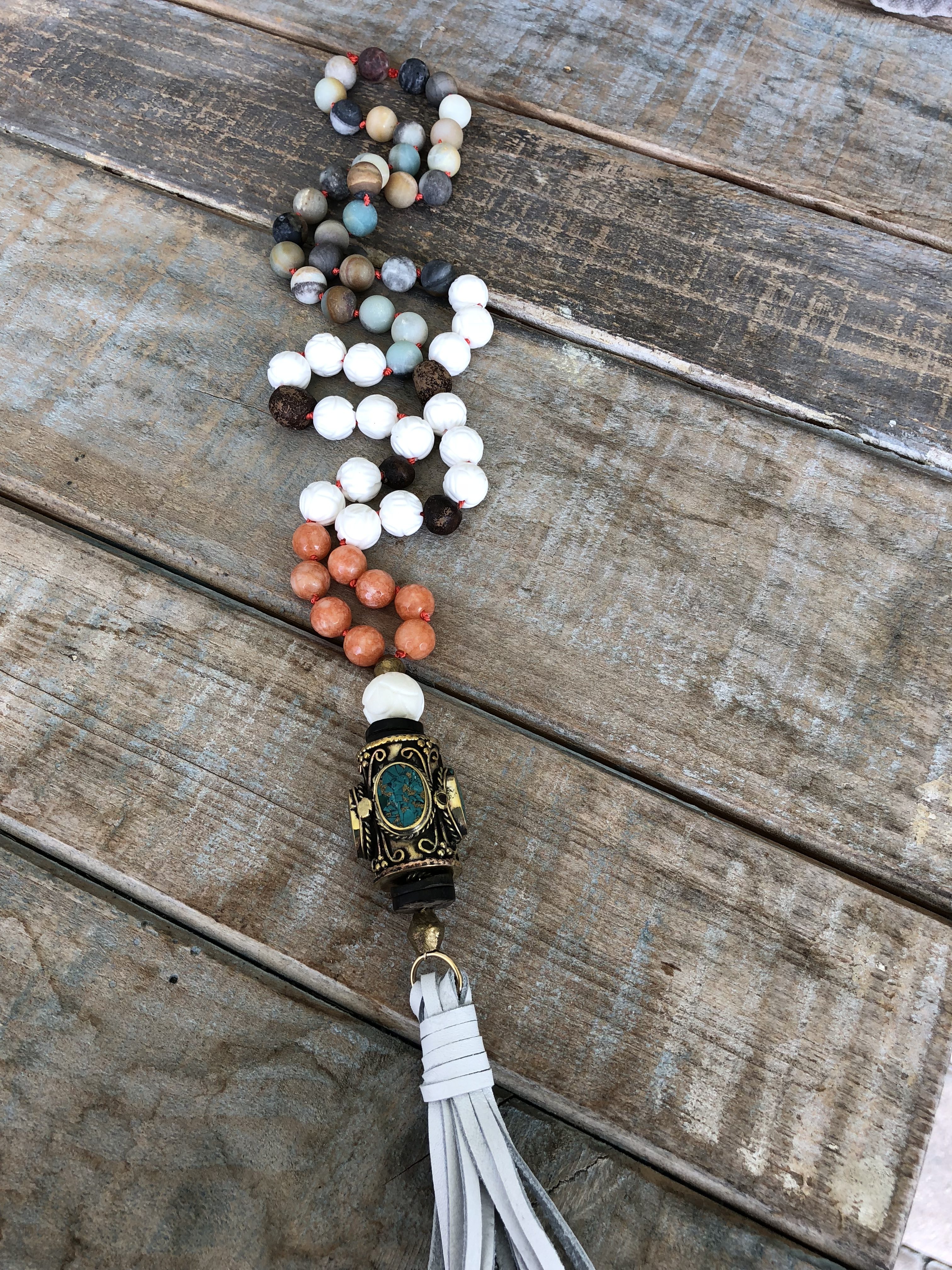 This gorgeous long necklace is made with 12mm carved white Tridanca, 10mm Matte Amazonite, and 10mm faceted orange Jade beads. It is hand-knotted silk cord and accented by African Wood Beads. This piece features a beautiful long white leather tassel and handmade Tibetan pendant. This piece is part of the Sea Breeze Collection and was designed so that it can be layered with the other necklace and paired with the stack of bracelets in the collection
