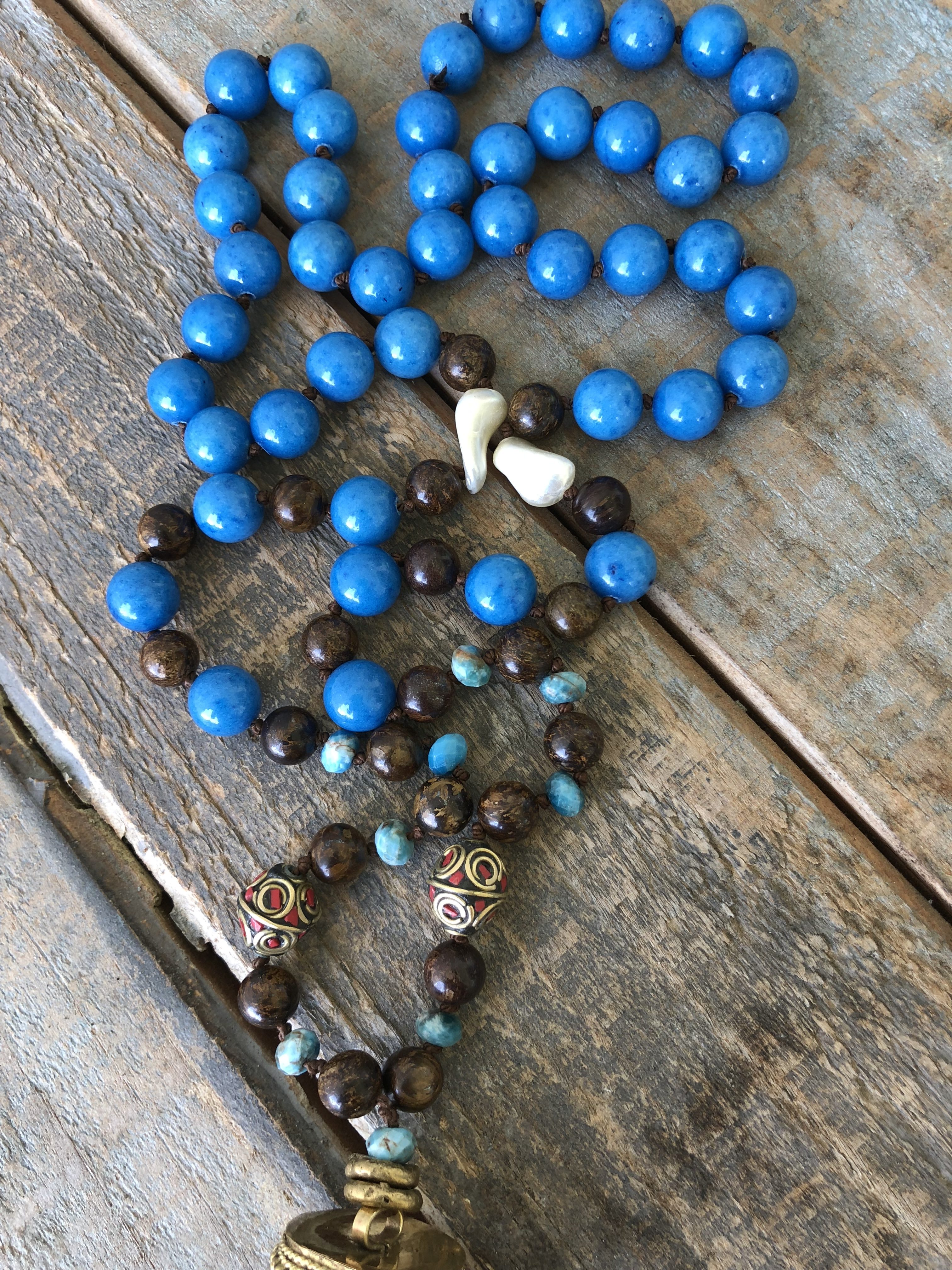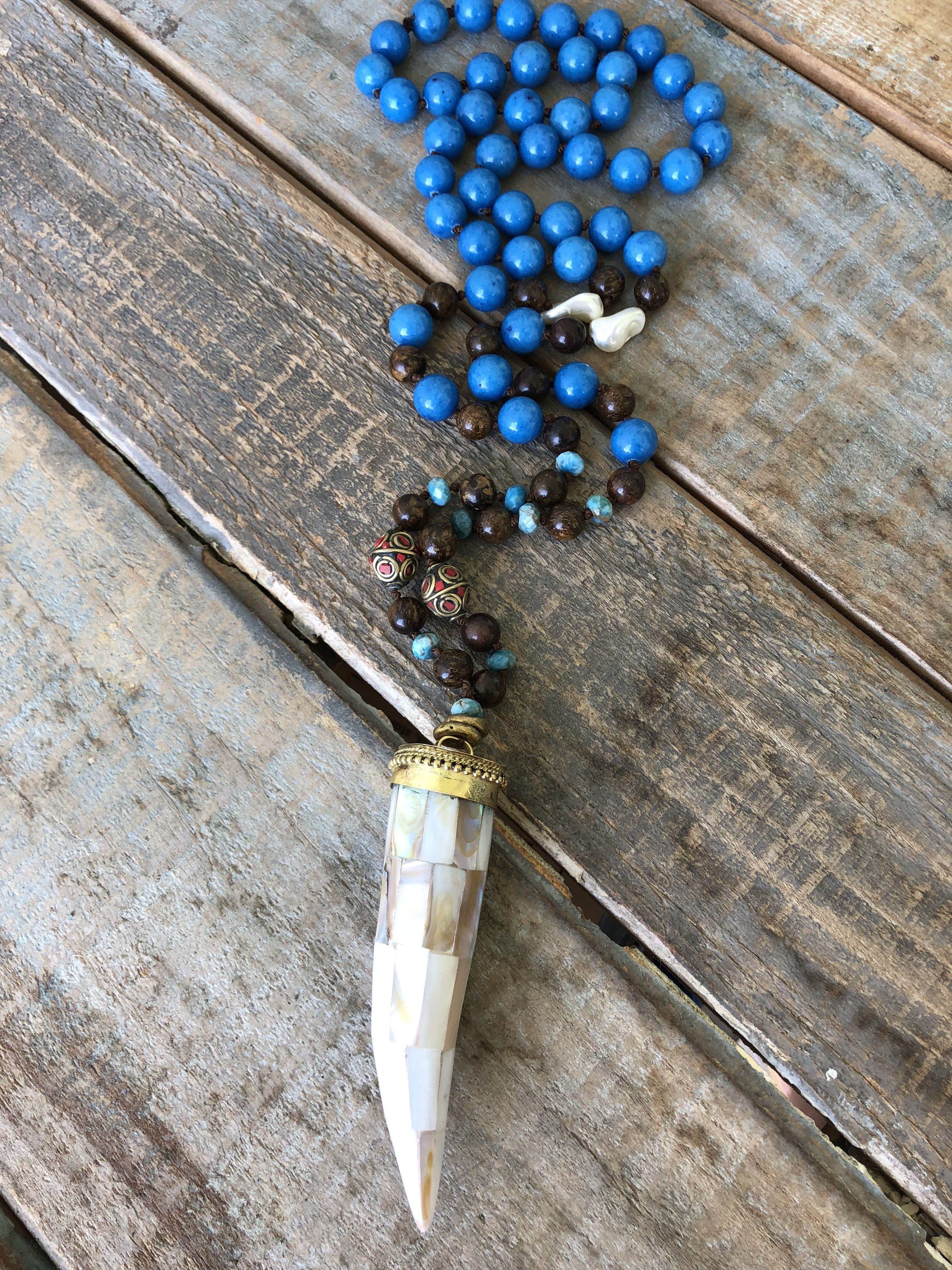 The Sevai’i long necklace is made hand-knotted on silk Cord with 10mm Polished Blue Jade, 8mm Tigers Eye, Apatite rondelles, and a sculpted Mother of pearl horn. Also contains freeform Mother of pearl and Tibetan accents throughout the necklace. Complete the look with its compliment, the Sevai’i Short Necklace, and a stack of bracelets from the Sevai’i collection.